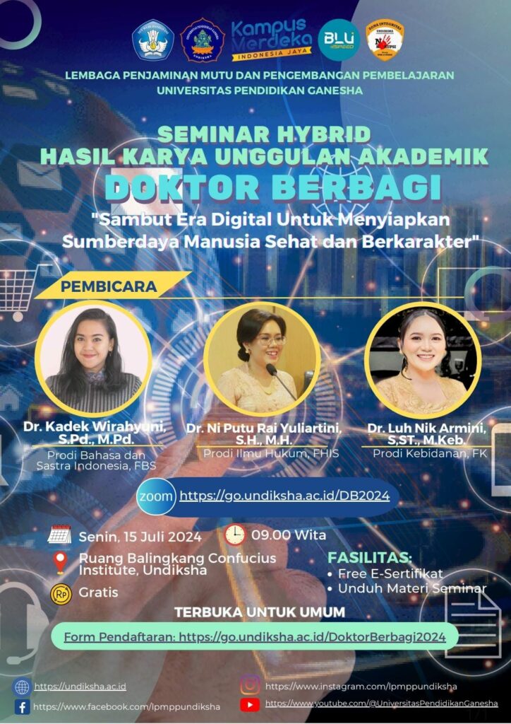 Singaraja | 12 Juli 2024. Universitas Pendidikan Ganesha (Undiksha) Bali akan menggelar seminar hybrid bertemakan “Sambut Era Digital untuk Menyiapkan Sumberdaya Manusia Sehat dan Berkarakter” pada Senin, 15 Juli 2024 di Ruang Balingkang Confucius Institute Undiksha. Seminar ini menghadirkan tiga pembicara terkemuka: Dr. Ni Putu Rai Yuliartini, S.H., M.H. dari Program Studi Ilmu Hukum Fakultas Hukum